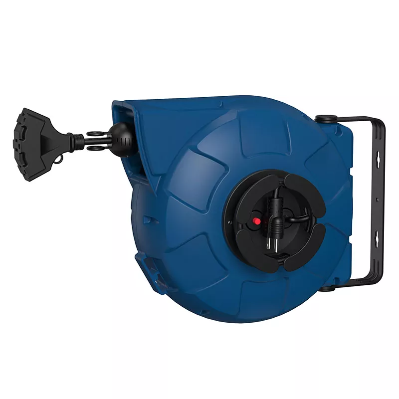 Stahlhalterung zur Wandmontage, stabiles Kunststoffgehäuse und praktischer Tragegriff: Die Elektro-Kabeltrommel ist die ideale Kabelverlängerung.